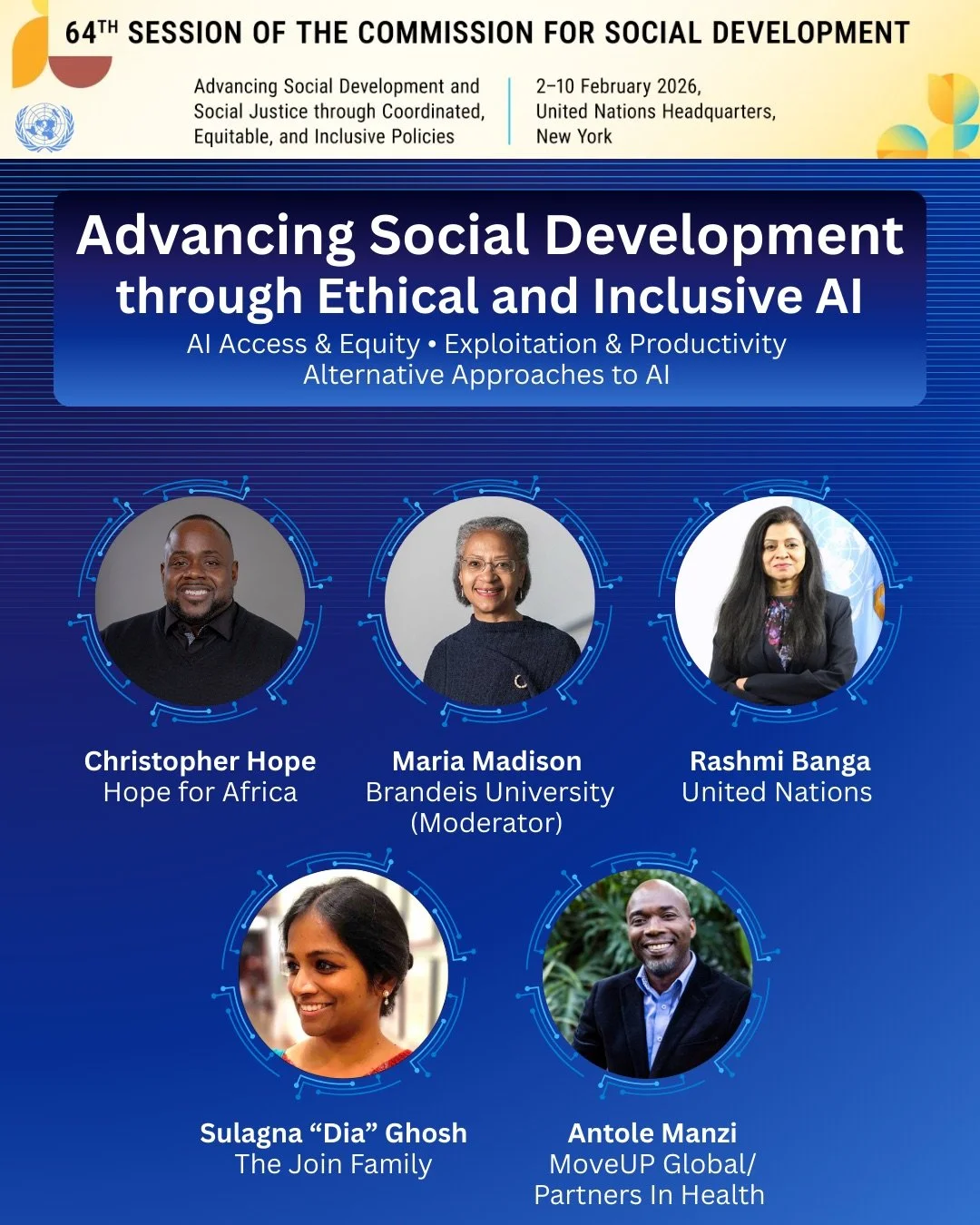A high-level virtual discussion at the 64th Session of the UN Commission for Social Development, exploring how ethical, inclusive, and equitable AI can drive social progress worldwide.